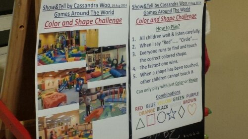 Show & Tell, 19 Aug 2014 2014/08/18 Featured 0 The name of this game is Color and Shape Challenge. When I say red circle, everyone runs to find it. The first one who finds it wins. Same color could not be touched for other children.